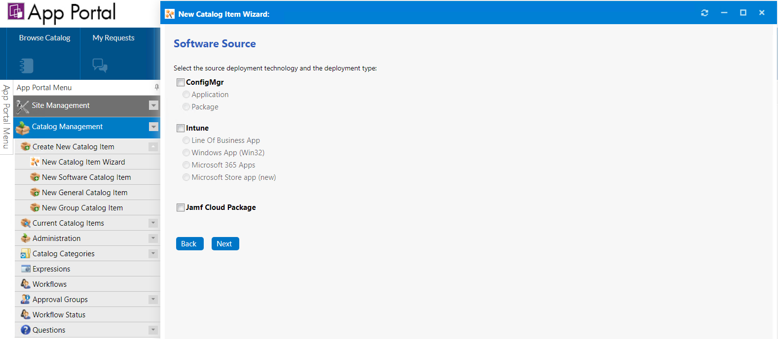 1. Under Catalog Management , select New Catalog Item Wizard . The Catalog Item Type panel of the New Catalog Item Wizard opens.
