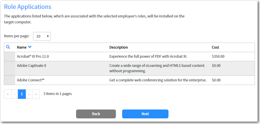 - From the Task sequence list, select the task sequence corresponding to the action you want to take, and then click Next . The Role Applications panel opens, listing the applications that are associated with the selected employee’s roles, which will be installed on the target computer.