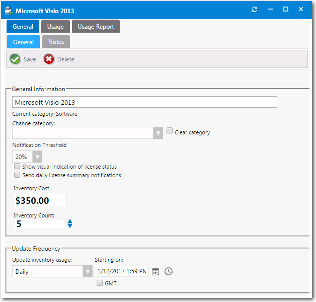 - Select the Send daily inventory summary notifications option if you wish to include this inventory item in the daily license summary report that is emailed to the License Administrator.